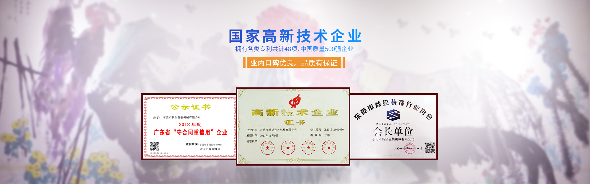 新望機械成立于1998年,位于東莞市東部工業(yè)園區(qū)的中心地帶——企石鎮(zhèn)東平村,交通方便、環(huán)境優(yōu)美舒適、視野開闊。公司注冊資本2000萬元,擁有辦公室、廠房等18,000多平方米。已通過ISO9001:2015國際質(zhì)量管理體系認證,擁有國家各類專利共計58項。是東莞市企石鎮(zhèn)工商聯(lián)副會長單位、東莞市企石鎮(zhèn)文學藝術界聯(lián)合會副主席單位、東莞市環(huán)保包裝行業(yè)協(xié)會副會長單位、東莞市數(shù)控裝備行業(yè)協(xié)會第二屆會長單位、廣東省包裝技術協(xié)會常務理事單位、廣東省膠粘劑行業(yè)協(xié)會理事單位、廣東省著名商標企業(yè)、國家高新技術企業(yè)。